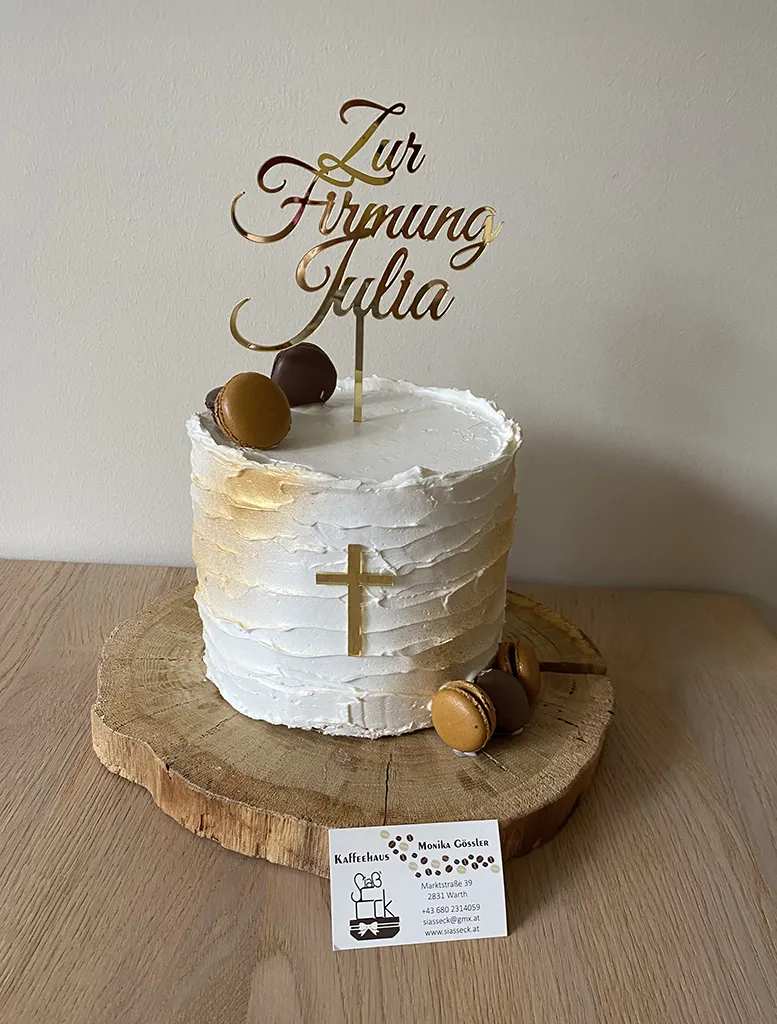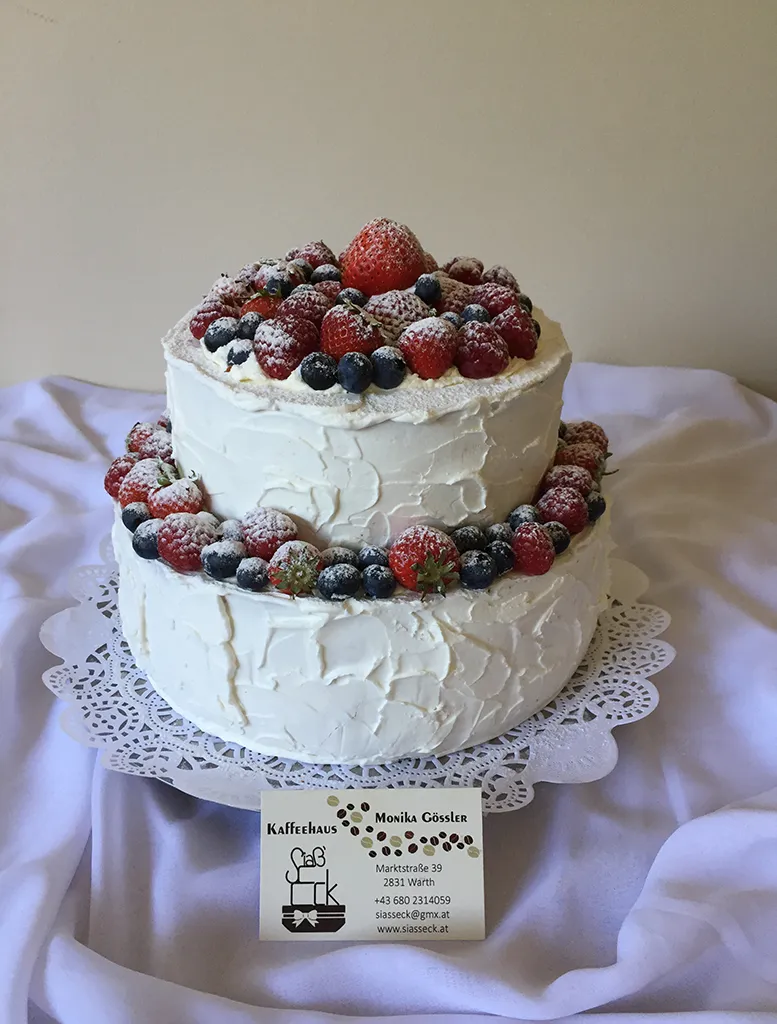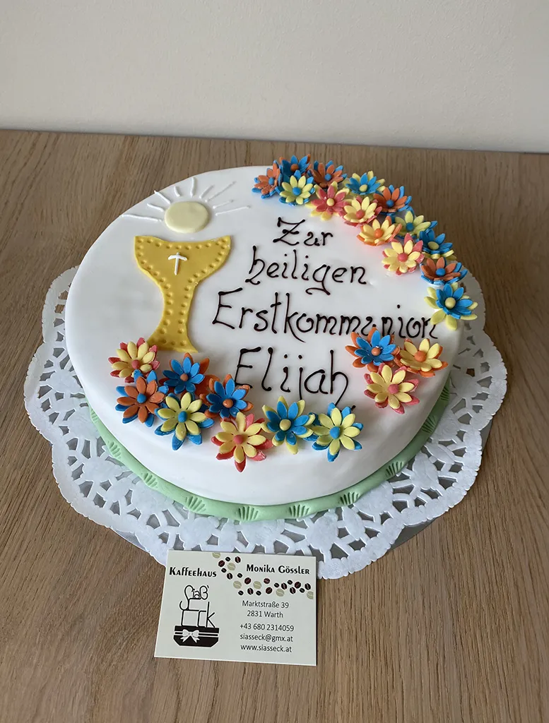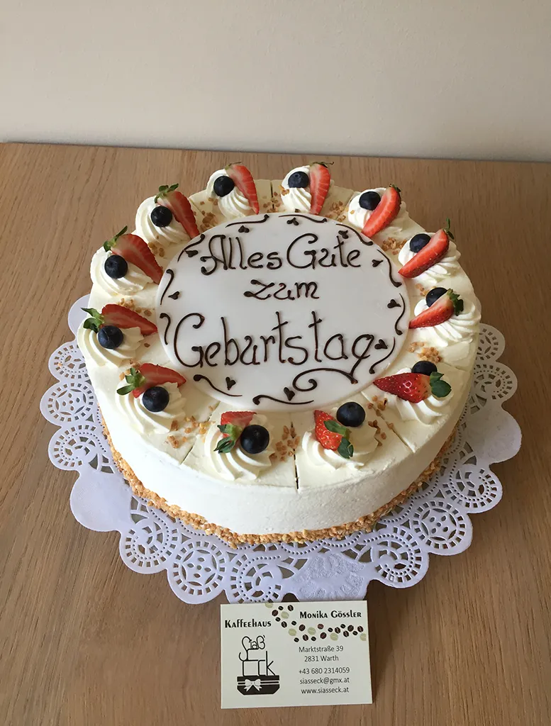 Ihr seid auf der Suche nach einer Torte für euer Geburtstagsfest, eine Taufe oder wollt eure Lieben einfach so mit einer leckeren Kuchenkreation überraschen, dann seid ihr bei uns im Kaffeehaus Siaß'Eck in Warth richtig. Mit handgeformten Marzipanrosen, aufwendigem Spritzdekor oder essbaren Fotos zaubern wir für euch süße Mehlspeisen.